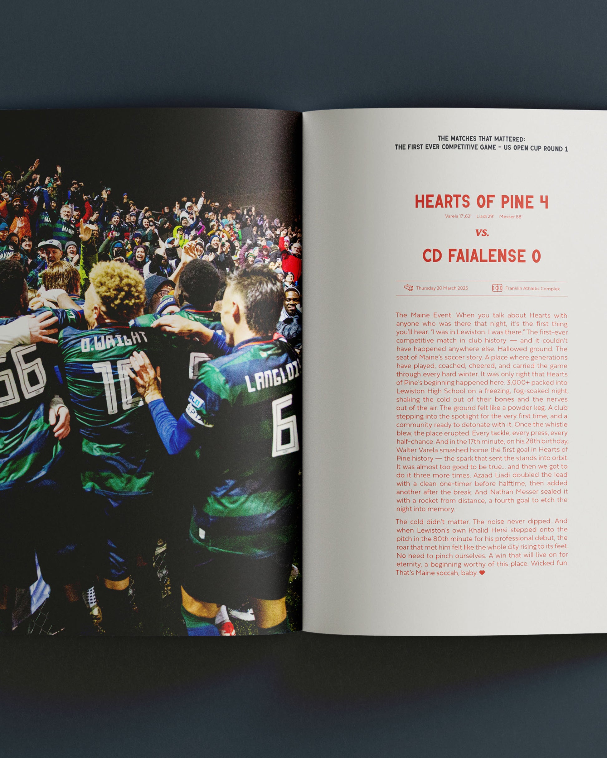 Through untold stories, never-before-seen imagery, and intimate reflections, this book goes far beyond the pitch. Featuring contributions from writers Amy Bass (Emmy Award-winning writer and author of One Goal), Nina MacLaughlin (The Boston Globe columnist and author of Wake, Siren), and Pablo Bayona-Sapag (Editor-in-Chief of ClubEleven), an exclusive conversation with The Ghost of Paul Revere’s Griffin Sherry, insights from the artisans behind the Man of the Match buoys, and the stories of the jerseys that have gone global from Brooklyn to Tokyo, from the stands to concert stages. Traversing topics of sport, identity, and purpose across the Pine Tree State and beyond, this book depicts milestones and moments, culture and creativity, and above all else, the community that has established Hearts of Pine as a beacon of Soccer for Good.