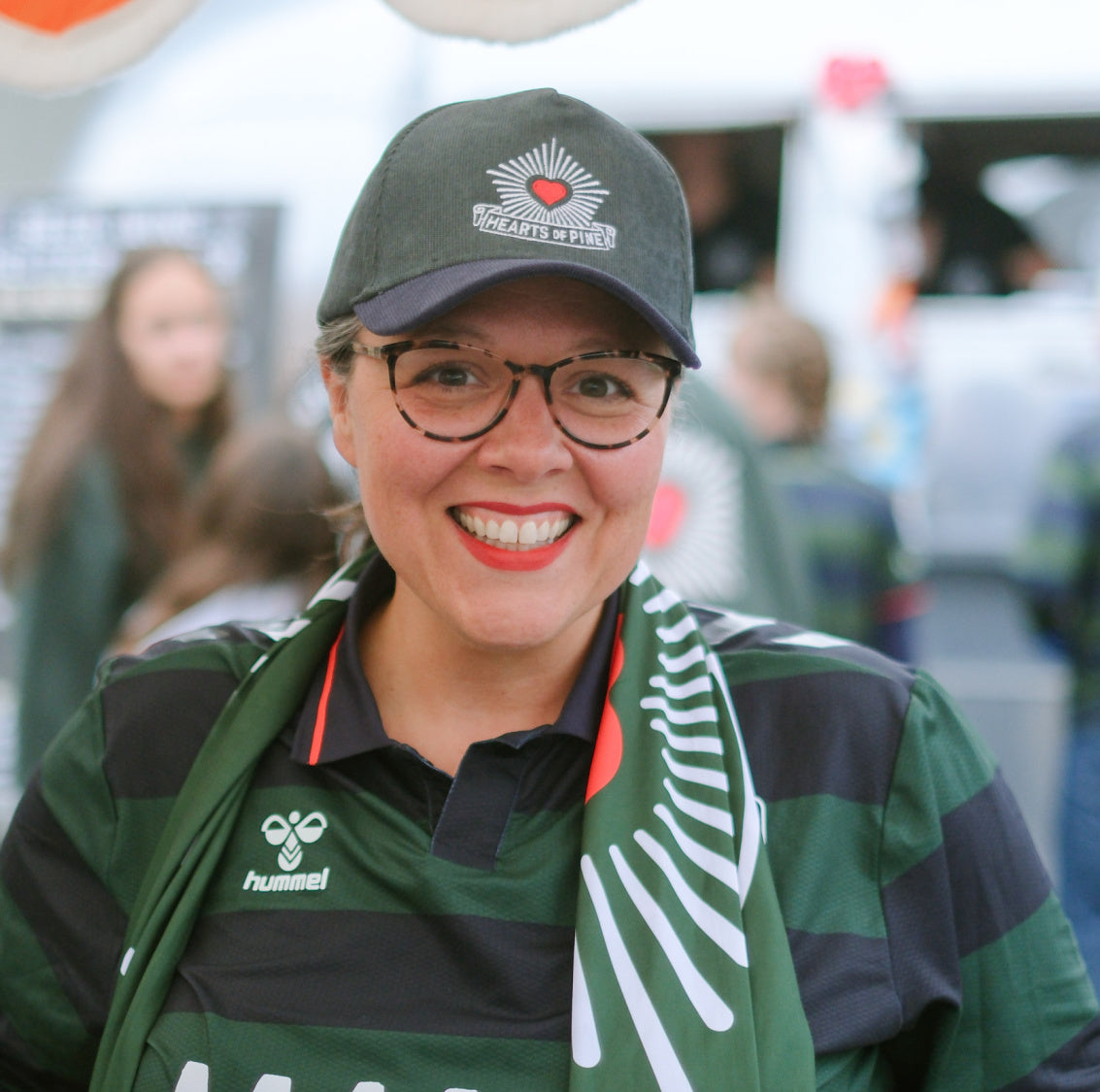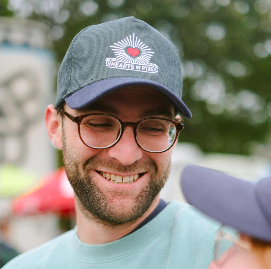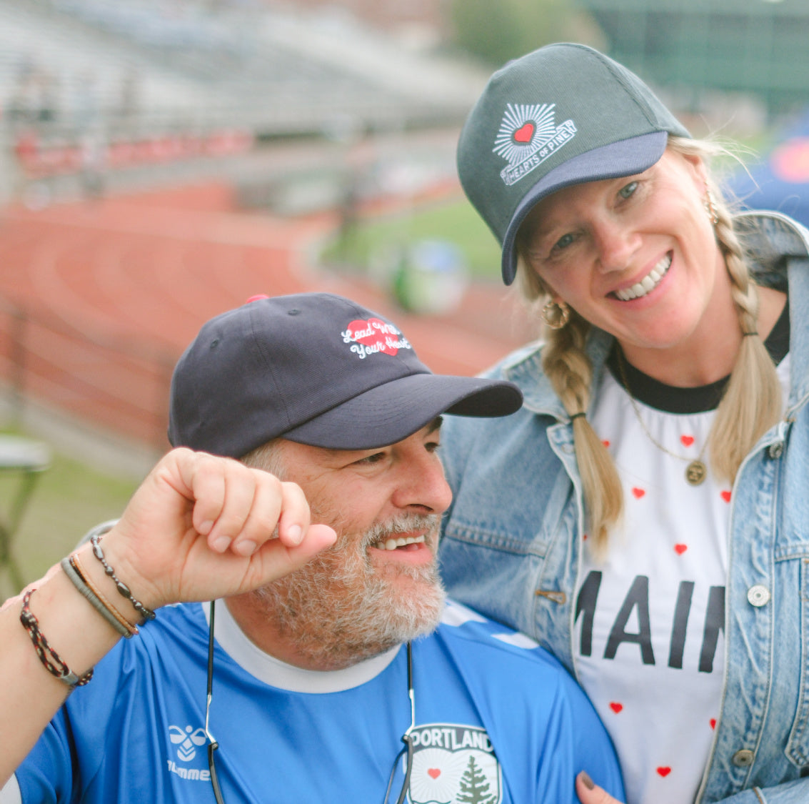 The Colorblocked Cord Hat features a green crown with a navy corduroy brim and matching top button. The front is embroidered with the Dirigo Heart and Hearts of Pine scroll in white, accented by a red heart at the center. Finished with an adjustable snapback, it’s built for comfort and everyday wear.