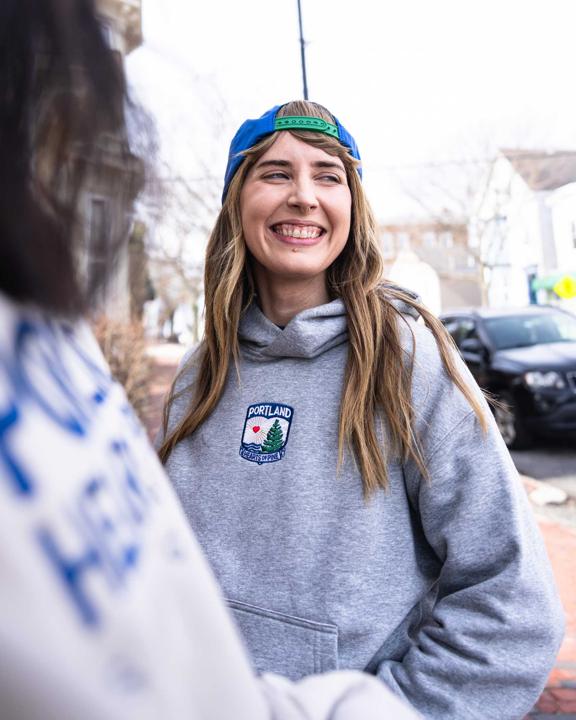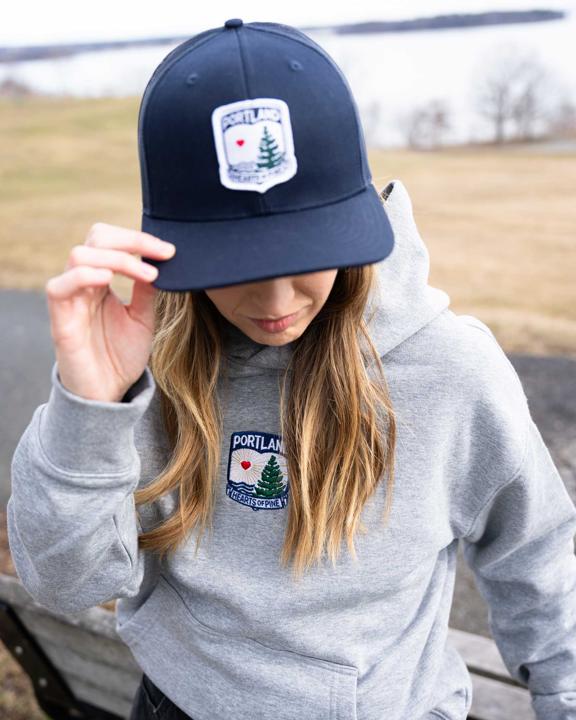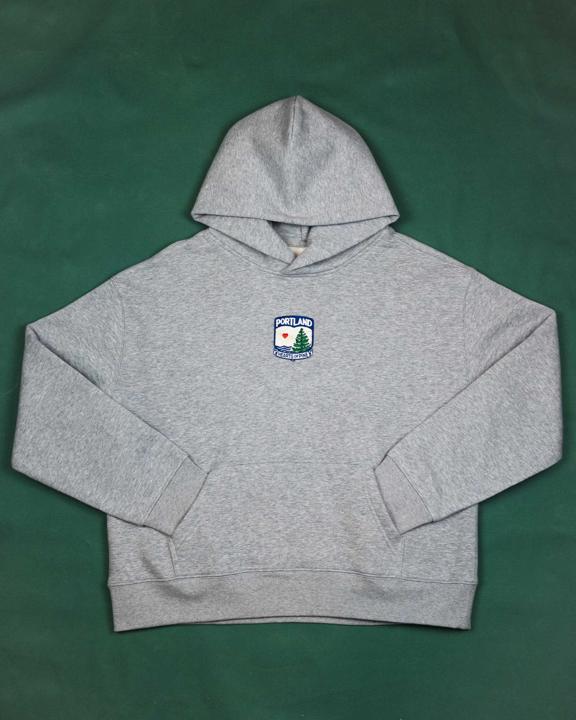 This women's grey sweatshirt features the embroidered Hearts of Pine crest centered on the front and includes a front pocket.
