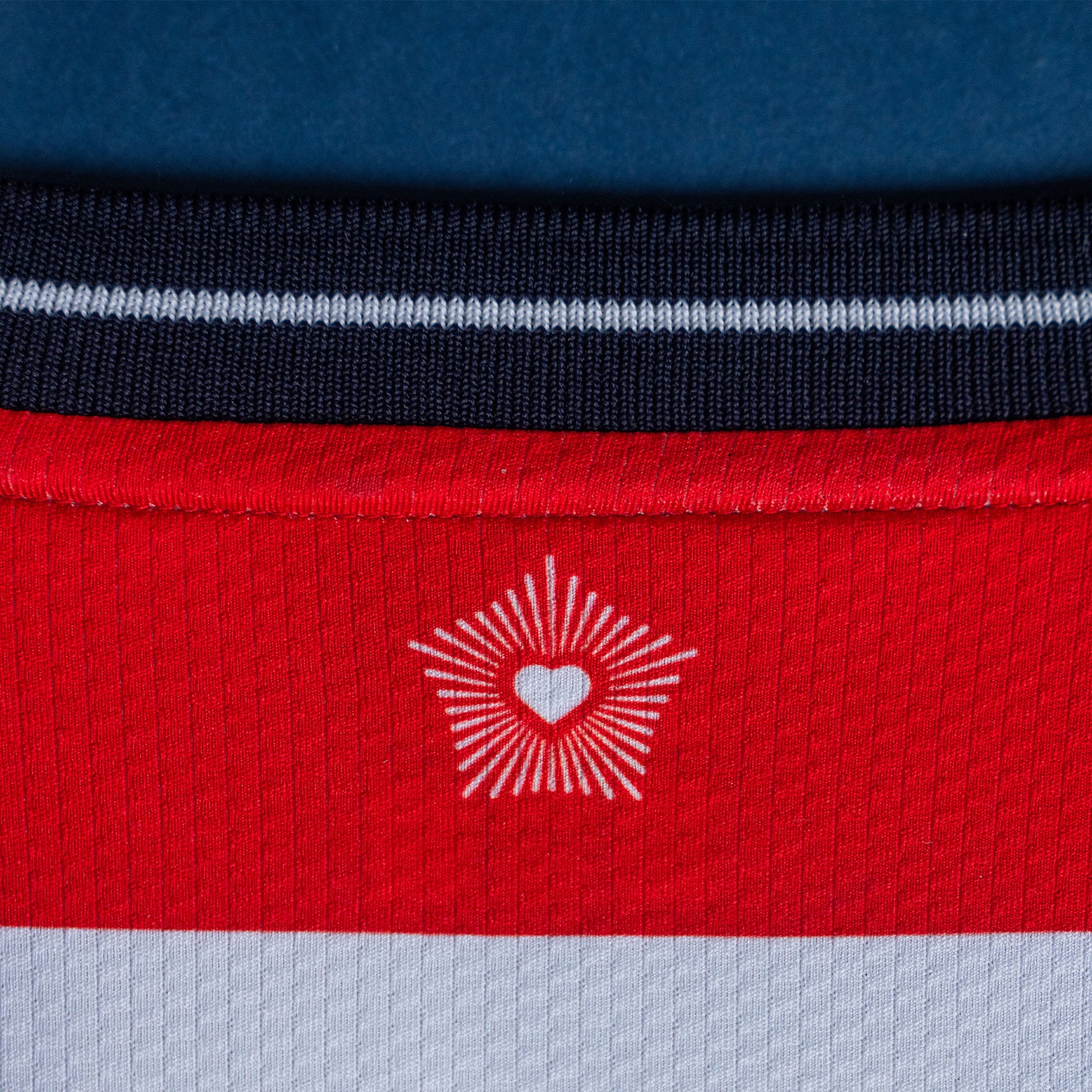 This short sleeve authentic features scattered throughout the red-and-white pattern are tonal heart details, a nod to Portland’s Valentine’s Day Bandit tradition and the club’s ethos, Lead With Your Heart, which appears again on the interior neck tape. The back of the jersey features the Dirigo Heart and a reflective hip tag introduces an evolution of that same mark, centering the Dirigo Heart within the lighthouse beacon.