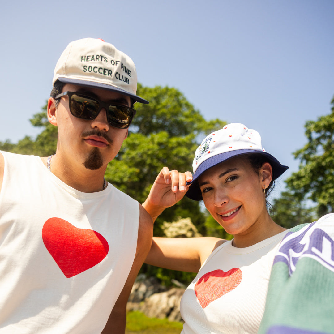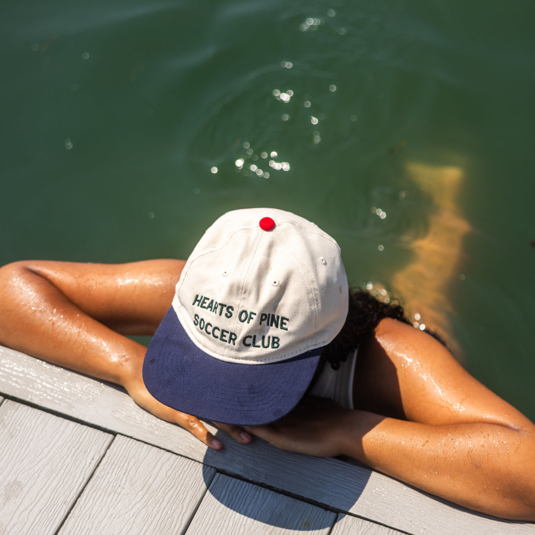 The Soccer Club of Maine hat features embroidered navy text on the front, the Dirigo Heart on the back, a navy brim, a tan crown, and a red top button.