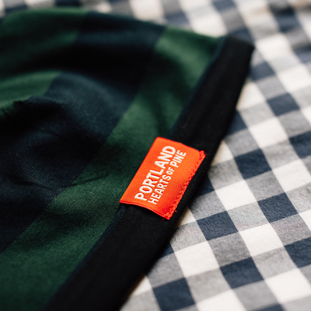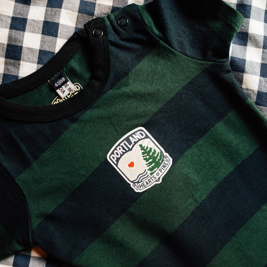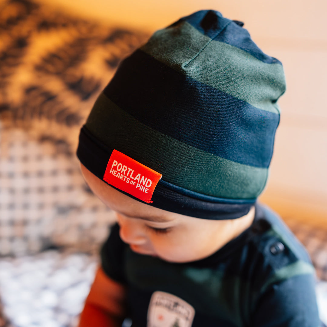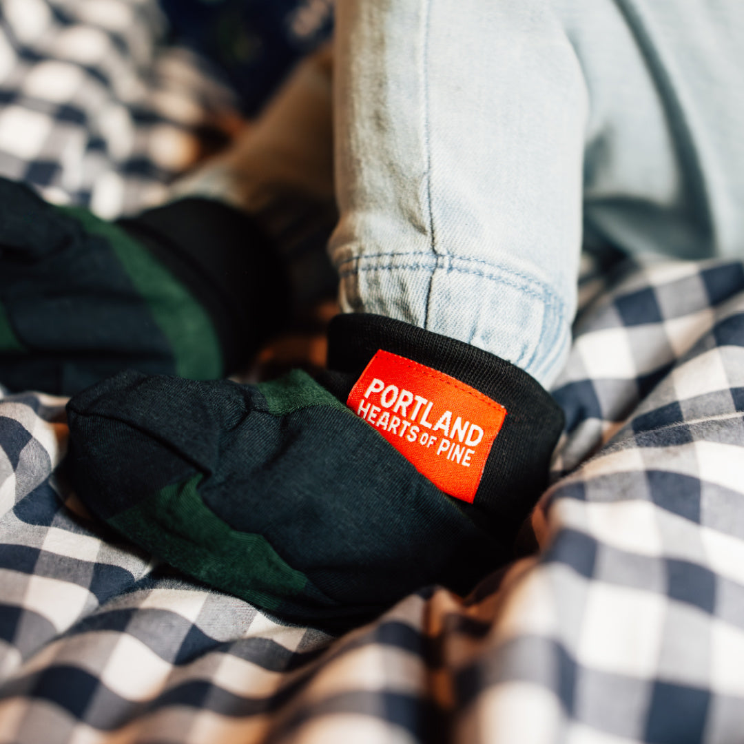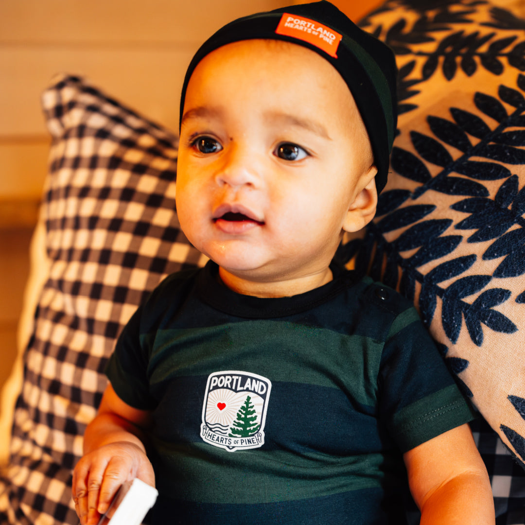 The green and navy onesie features the Hearts of Pine crest at the center and easy on-and-off snaps at the base for quick outfit changes, as well as at the shoulders. The matching navy and green cap includes a prominent red Portland Hearts of Pine tag, and the soft cotton booties complete the look with a navy cuff and green-and-navy hoops at the base.