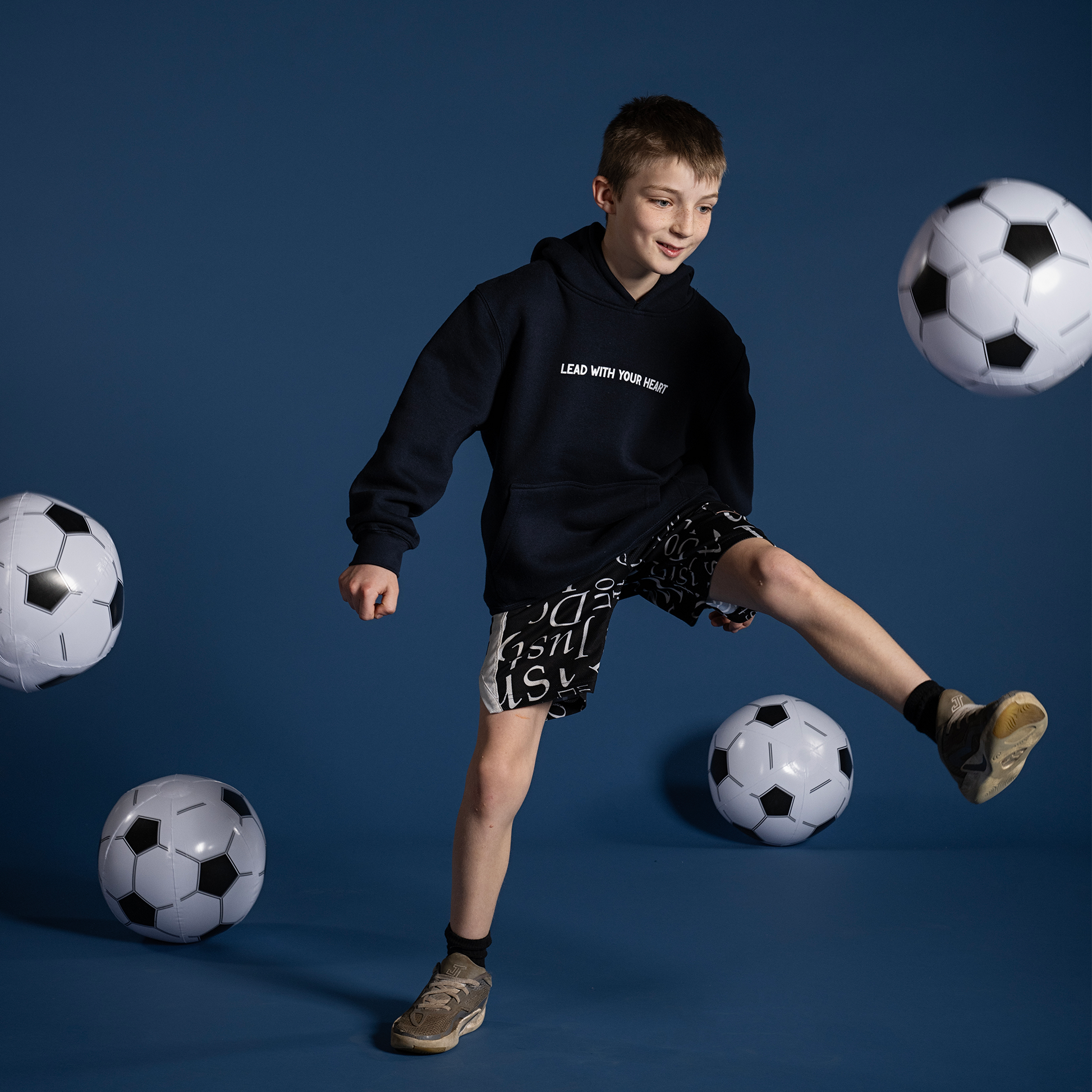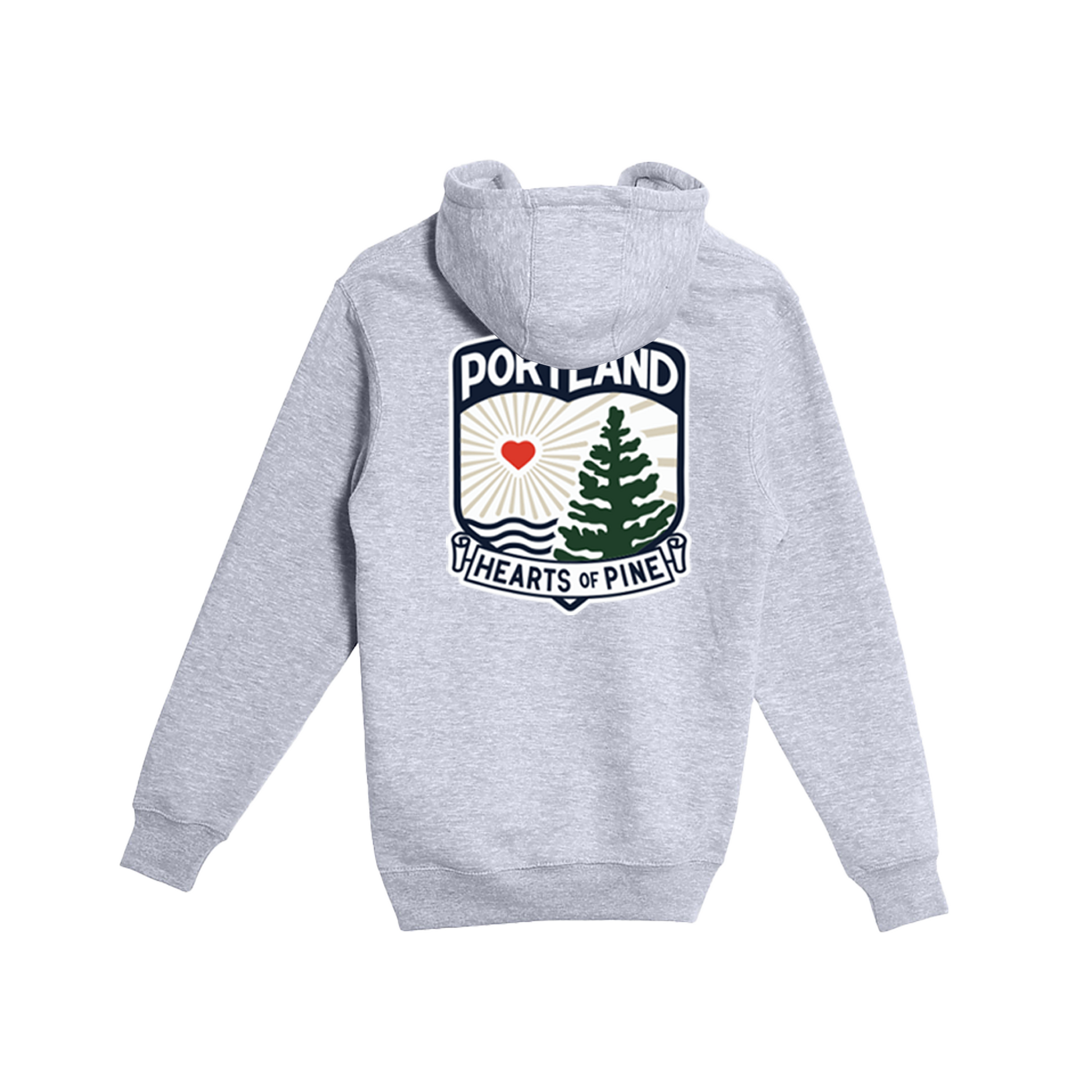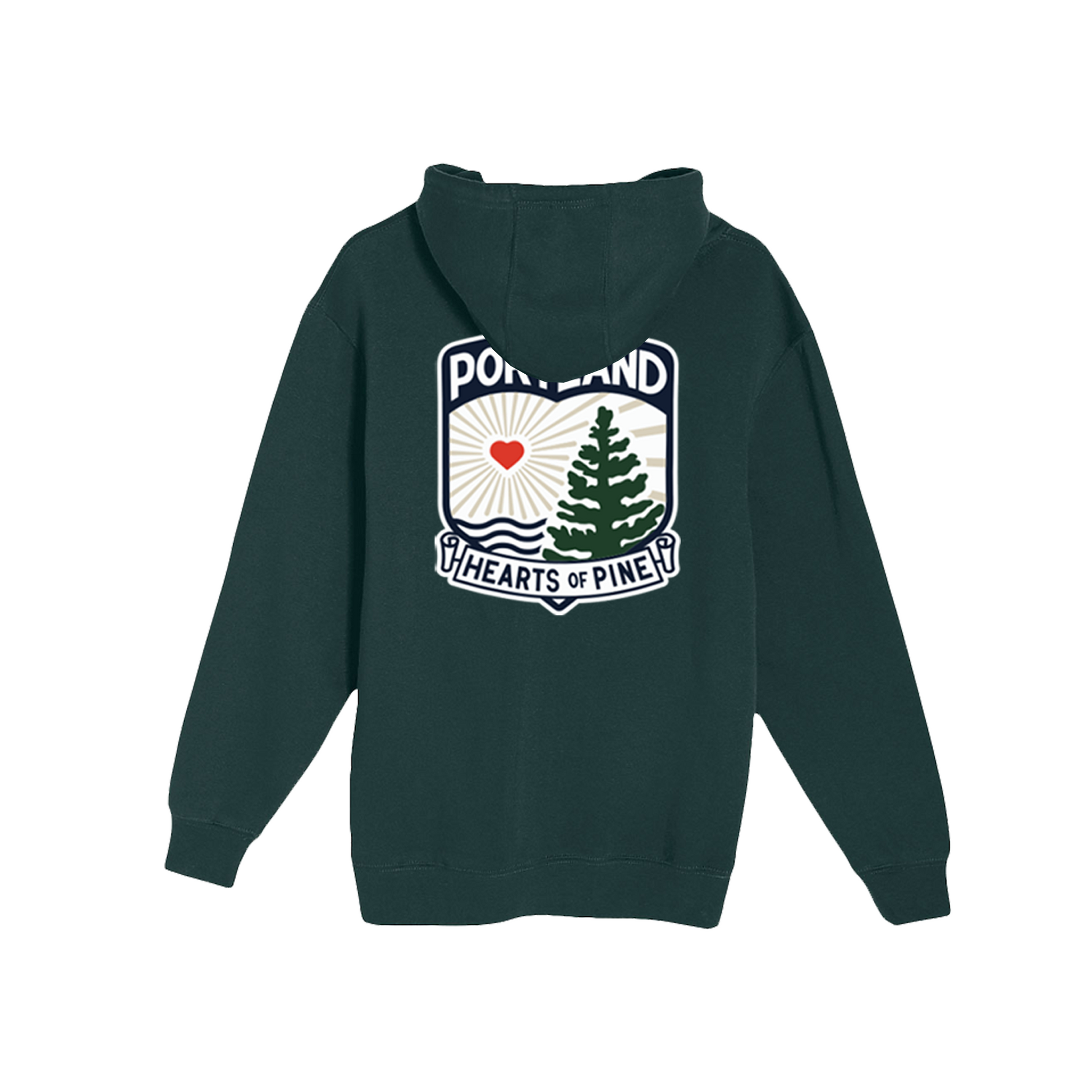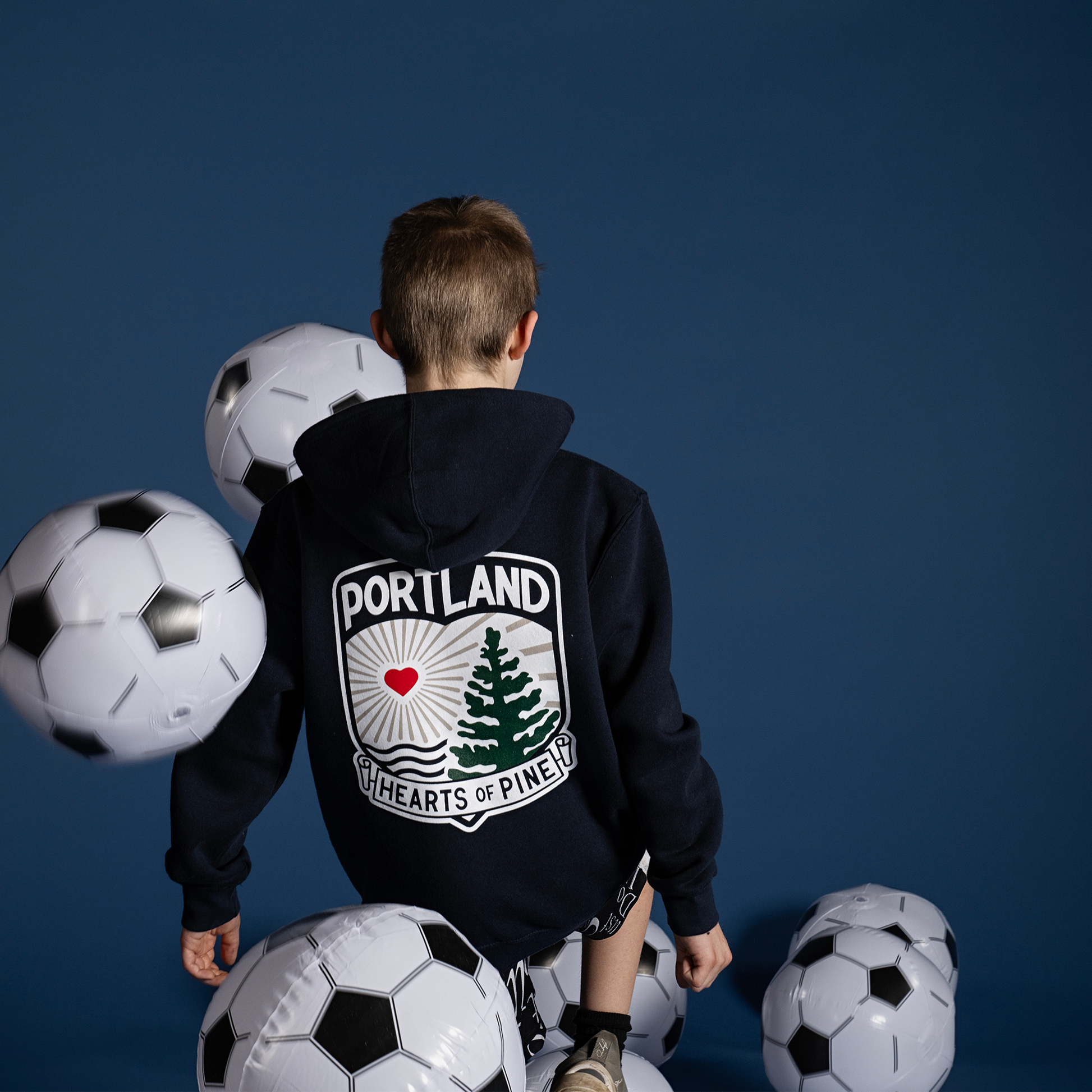 The navy hoodie features the Portland Hearts of Pine wordmark on the front and includes a front pocket.